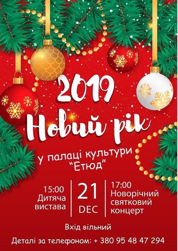 Всі мешканці та гості міста Дружківка запрошуються на Новорічний святковий концерт у палац культури «Етюд».