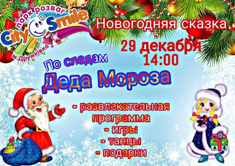 В предвкушении Нового Года нам всем хочется верить в чудеса. «City Smile» приглашает всех девчонок и мальчишек на новогоднюю сказку, где вас ждут Дед Мороз и Снегурочка, Веселый Эльф, Мики и Мини Маус, Баба Яга, Симка и Забавные птички, которые подарят отличное настроение, игры, подарки и конкурсы.