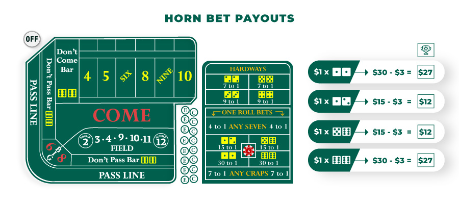 Отже, гравець, який поставив 4 долари на ставку "Рог", отримає по 1 долару на кожне з 2, 3, 11 і 12. Якщо випаде 2 або 12, гравець виграє 30 доларів. Якщо випаде 3 або 11, гравець виграє ₴600. Ось так просто.